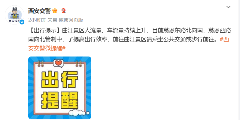 据西安交警消息,曲江景区人流量、车流量持续上升,目前慈恩东路北向南、慈恩西路南向北管制中,为了提高出行效率,前往曲江景区请乘坐公共交通或步行前往。