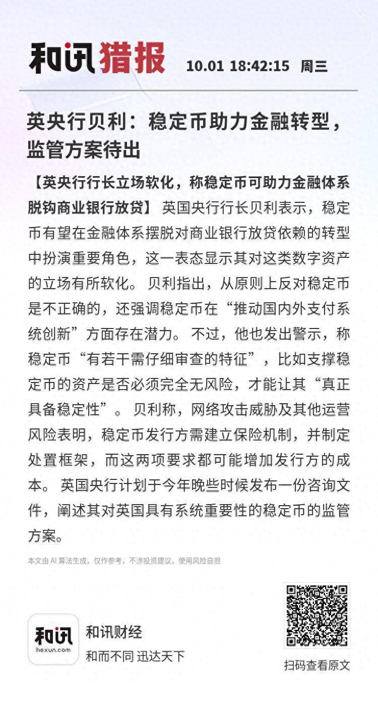 【英央行行长立场软化,称稳定币可助力金融体系脱钩商业银行放贷】英国央行行长贝利表示,稳定币有望在金融体系摆脱对商业银行放贷依赖的转型中扮演重要角色,这一表态显示其对这类数字资产的立场有所软化。 贝利指出,从原则上反对稳定币是不正确的,还强调稳定币在“推动国内外支付系统创新”方面存在潜力。 不过,他也发出警示,称稳定币“有若干需仔细审查的特征”,比如支撑稳定币的资产是否必须完全无风险,才能让其“真正具备稳定性”。 贝利称,网络攻击威胁及其他运营风险表明,稳定币发行方需建立保险机制,并制定处置框架,而这两项要求都可能增加发行方的成本。 英国央行计划于今年晚些时候发布一份咨询文件,阐述其对英国具有系统重要性的稳定币的监管方案。