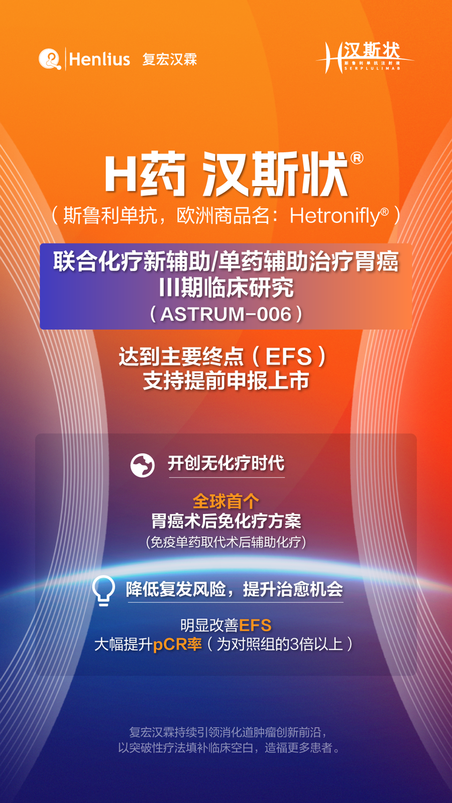 ASTRUM-006是一项针对早期胃癌患者的随机、双盲、多中心的III期临床研究,旨在评估汉斯状®联合化疗对比安慰剂联合化疗新辅助/单药辅助治疗早期胃癌患者的临床有效性及安全性。结果显示,与安慰剂联合化疗相比,该方案明显改善无事件生存期,病理完全缓解率是对照组的3倍多,患者复发风险显著降低,治愈机会提升。同时,该治疗方案安全性良好,未发现新的安全性信号。基于这一积极结果,建议提前申报上市。